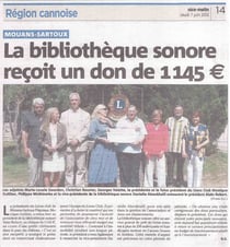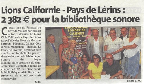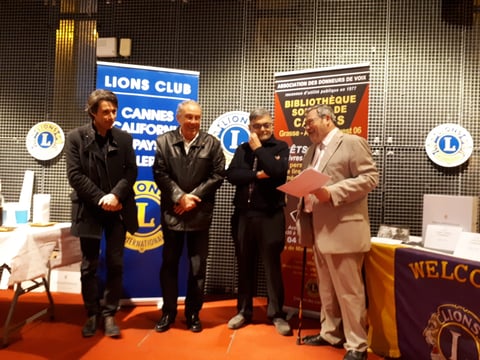 Lors d'une petite cérémonie, le Lion's club de Mouans Sartoux - Pegomas a remis un chèque à la Bibliothèque Sonore de Cannes.