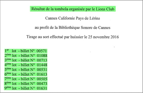 Résultats de la tombola